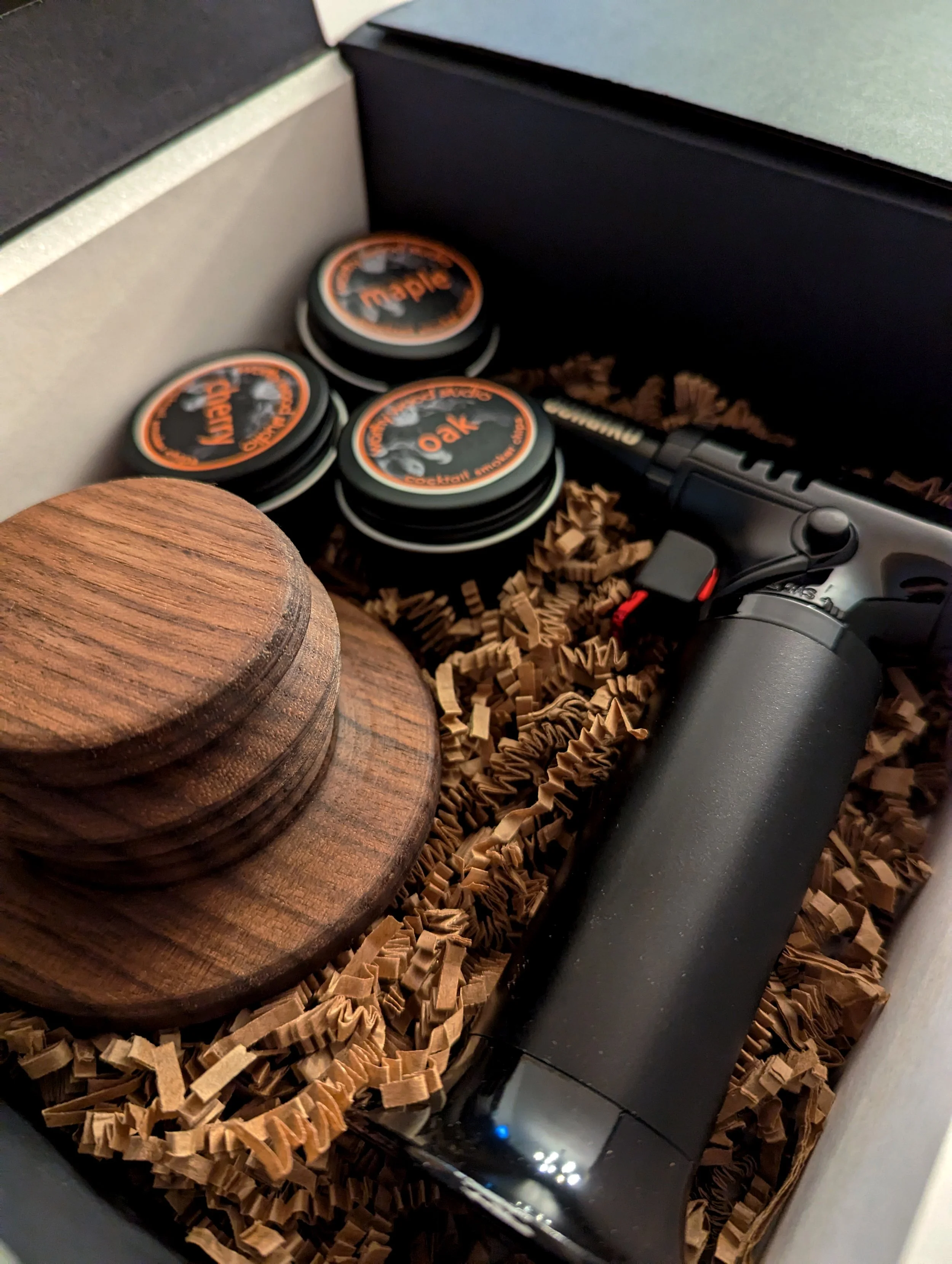 Each smoker kit contains the smoker itself, 3 tins of different aroma wood chips, and a pre-filled kitchen butane torch.